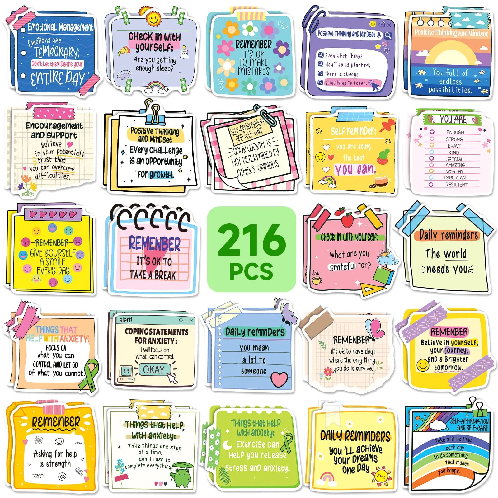 [Our mental health sticker set featuring 216 individual stickers in 54 different designs. Each design has 4 pieces allowing you to spread positivity and mindfulness wherever you go Our stickers feature positive messages centered around mental health and mindfulness perfect for reminding people to stay positive and focused throughout the day. The larger size makes it easy to read the thoughtful statements These awareness stickers can be applied to laptops journals luggage planners scrapbook vision boards and more. Show off your unique style and personality while spreading positivity and mindfulness in your daily life Share the gift of positivity and mindfulness with teachers students colleagues friends and family members. These reminder decals stickers make thoughtful and meaningful gifts for anyone looking to enhance their mental well-being If you have any questions feel free to contact us at any time. We will do our very best to solve your problem]